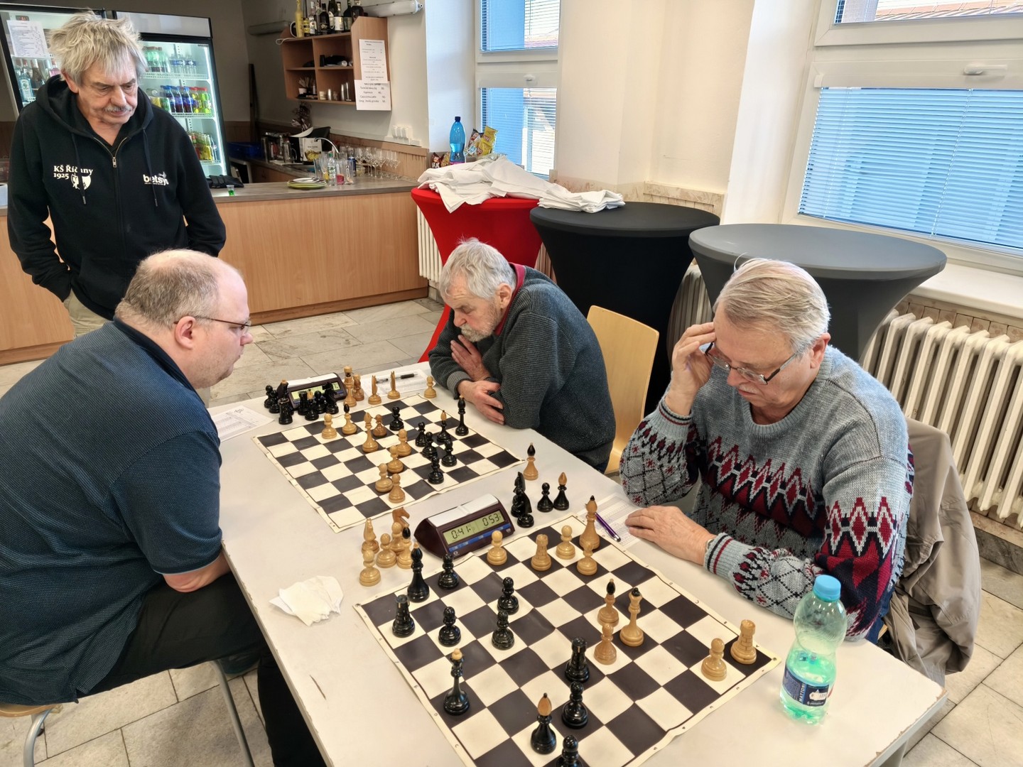 Začalo se v deset. Prvý prohrává Břetislav Hlavica. Zahájení v pohodě, jen se mi zdálo, že stojím černými trochu stísněně, tak jsem se nešťastně pokusil uvolnit a bylo po partii.