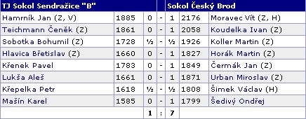 Utkání se nám vůbec nepovedlo. Omluvou a vysvětlením může být, že tento soupeř byl hodně silný a i když byl v našich silách příznivější výsledek, na vítězství to nevypadalo. Jejich průměrné ELO bylo vyšší než naše skoro o dvě stovky a i ten jejich poslední hráč na osmé desce ho měl vyšší než Bohouš Sobotka na třetí.